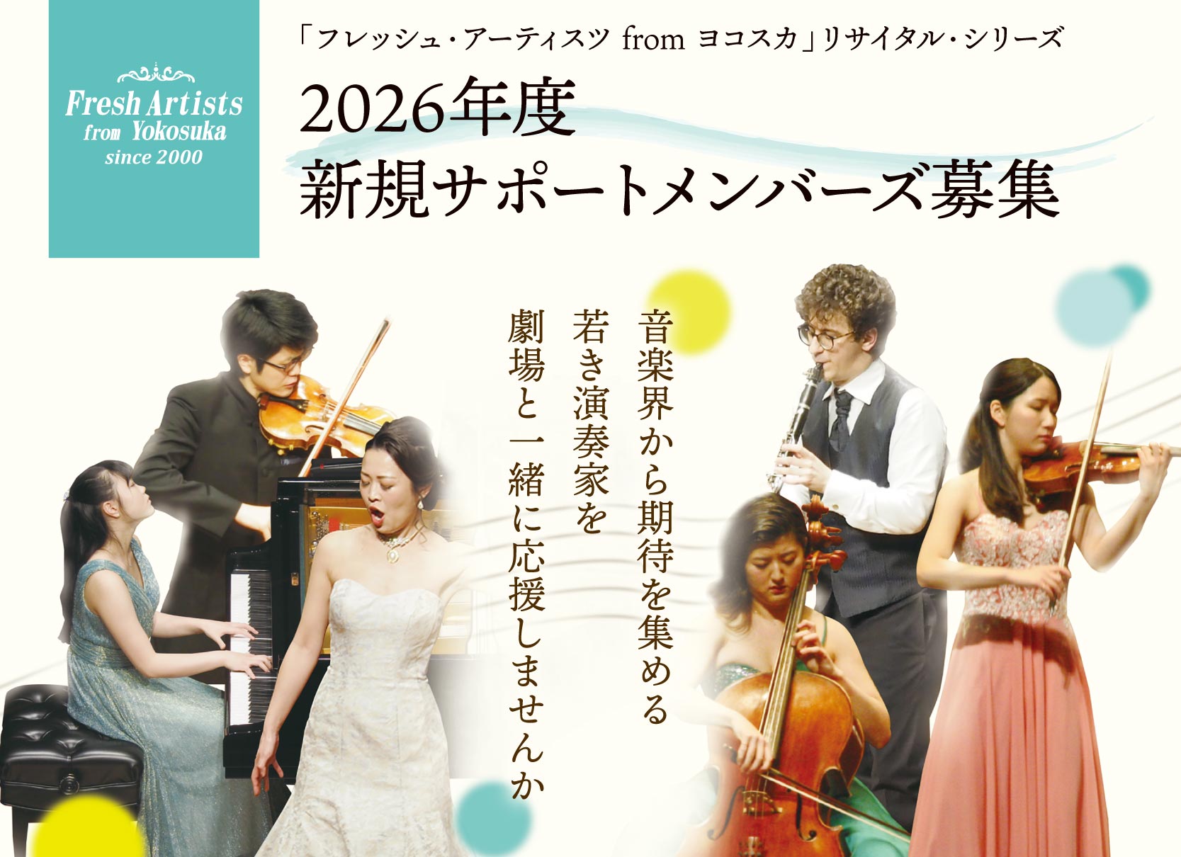 この「フレッシュ・アーティスツ from ヨコスカ」リサイタル・シリーズは、2000年に若手演奏家を支援する目的で始まり、これまでに67回(2025年11月末現在)のリサイタルを開催してまいりました。