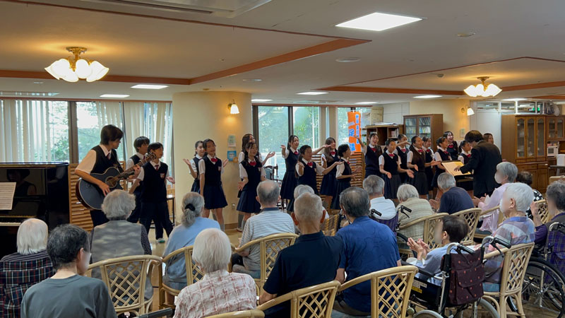 当合唱団の愛唱歌である「元気に笑え」や7月にサマー・コンサートで演奏した曲のほか、利用者の皆さまのそばにいき唱歌を一緒に歌いました。そして、愛や感謝の気持ちをストレートに歌うポピュラー・ソングも聴きどころで、「チェリー」では団員の1人がギターを披露、皆さまには手拍子もいただき温かい一体感のなか終演となりました。